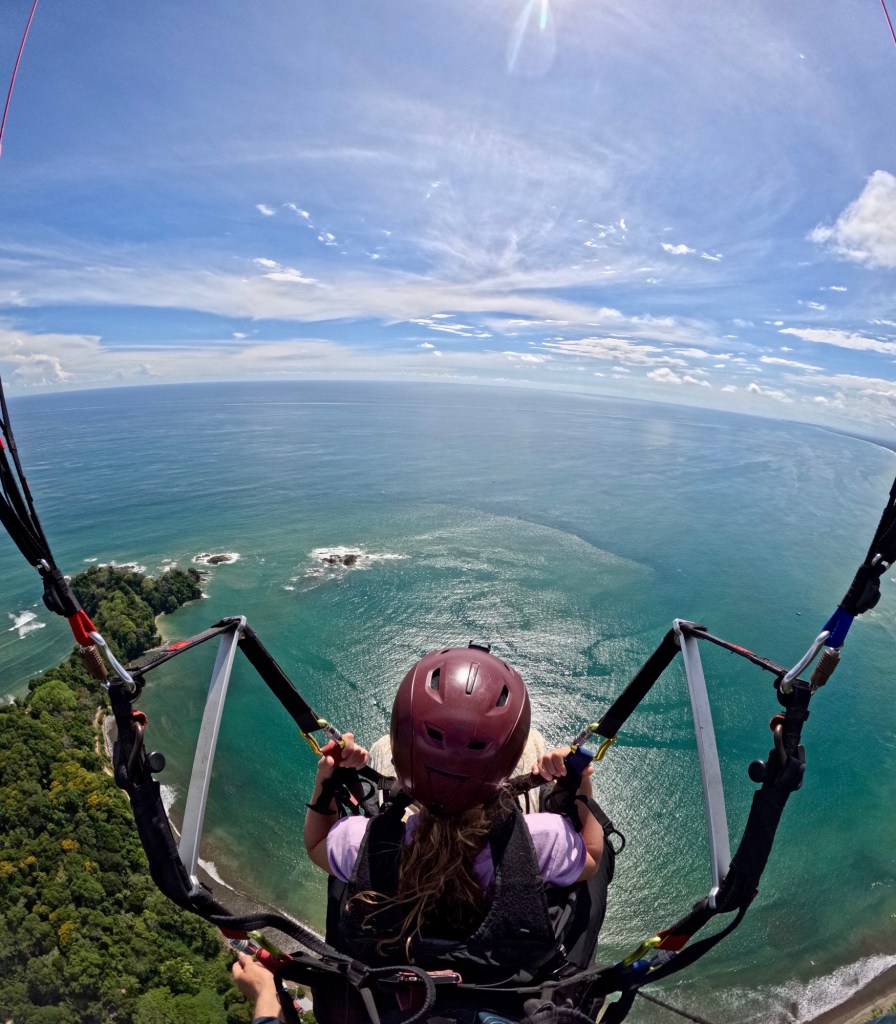 After about 20 minutes of soaring, we made our way down towards the primary landing zone at Dominical Beach. I watched Lidia gently touch down, then lined up for our own approach. The pilot told me to just lift my feet and let the airbag do the rest – we glided down over the beach, flared, and set down gently on the sand.