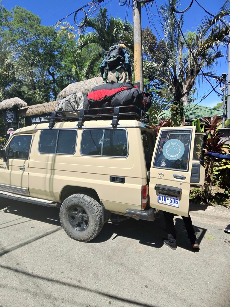 Three guys met us at Mama Toucan’s Organic Grocery right on time – a Frenchman, a Spaniard and an Argentinian – all multilingual and with 30+ years of experience between them despite their combined ages seeming to be about 40. We piled into their Land Cruiser with chute packs on the roof and set off on a 20 minute drive up a very, very, very steep hill to the jump point.
