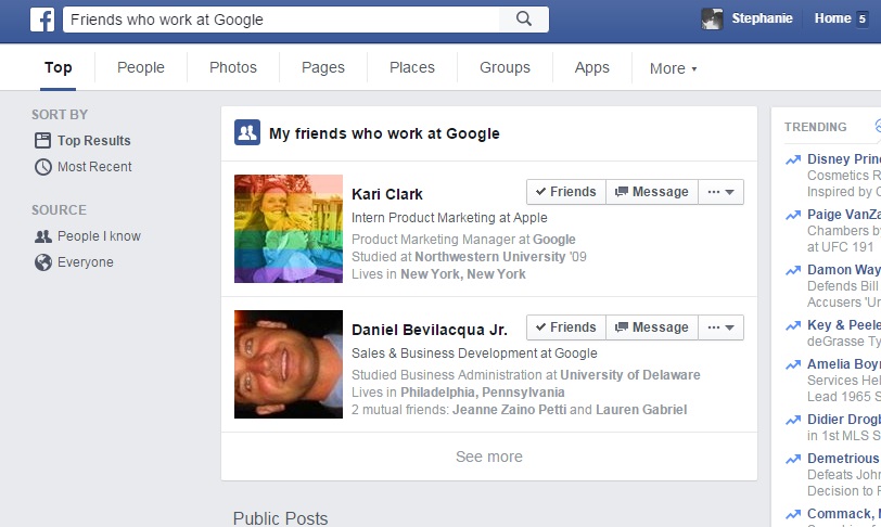 Also, this is a great time to network. On a side note, coming out of undergrad I was very hesitant to play the Networking game. I naively wanted to feel like I achieved everything I had on my own, without “cheating.” After working for a few years, I learned that success is actually a combination of three things: hard work, luck and help from those around you. Your neighbor may have gone to college with the Hiring Manager for the job you have your eyes on. Ask your Facebook friends if they know the people in charge at the place you want to go. Did you know you can search Facebook for people who work at specific companies? Simply type in “Friends who work at ________” and you might be surprised to find that someone you know works at the company or school where you need an “in.” Here’s an example from my page of “Friends who work at Google.”