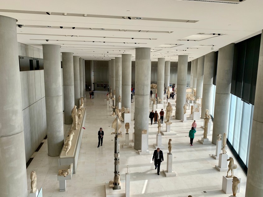 As you reach the top floor of the museum, you suddenly realize you are inside a modern rendition of the Parthenon. There are 17 columns spanning the longest side of the museum, and in between each are carved marble blocks which were once part of the upper ceiling of the inner portion of the Parthenon. The pieces were excavated years after the ammunition explosion that destroyed much of the structure. Also from the top floor, huge glass windows allow for parallel viewing of the real deal.
