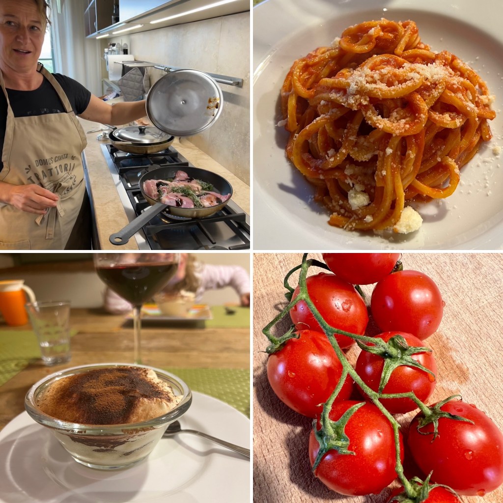 I’m not sure words can do any service to the beauty of this villa, so I’ll just say that we finished the evening with a meal cooked here in our kitchen by Valeria, the sister of the owner. Our first course was fresh tomato bruschetta with a potato and egg torte. Next we had handmade spaghetti (a kid favorite), followed by Chicken Cacciatore, but not like the version I know… this one required cooking the chicken in white wine until nearly all the wine reduced, then adding balsamic, fresh rosemary and a touch of olive oil. That’s all then reduced down to a sticky, delicious broth. Man how I wish I could capture the aromas for you to experience.