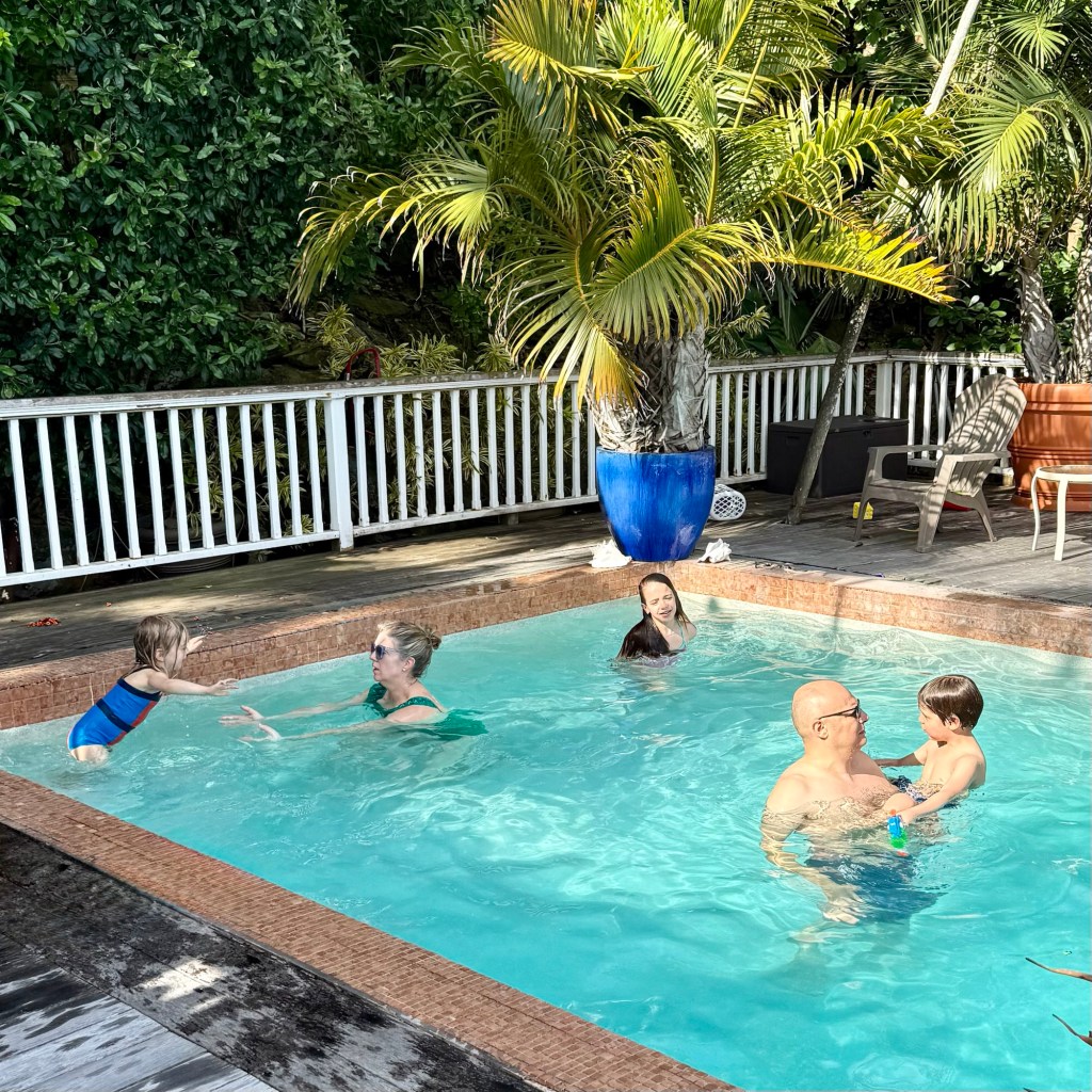Amir never made it into the pool yesterday, so his first order of business was checking out the 92 degree water. The rental is well-appointed, complete with water noodles, goggles, snorkeling gear, beach chairs, huge fluffy towels and even badminton rackets. With three bedrooms across two floors, it works well for our crew of six.
