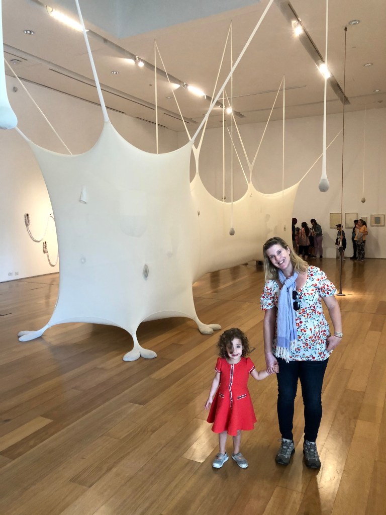 The current exhibit is by Earnesto Neto, a Brazilian sculptor who’s exhibits are biomorphic, made of soft stretchy fabrics, crochet and other natural fibers. They are meant to be touched, stretched and interacted with by visitors.