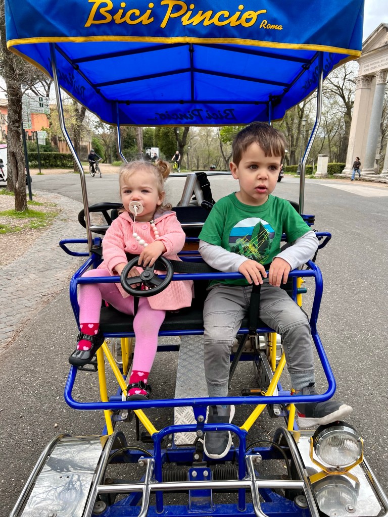 We’d intended to rent a golf cart today, but thankfully that didn’t go as planned. Our AirBnB is deliberately near a large garden/park area called Villa Borghese. We learned early on that booking a stay with a playground or open nature space nearby is key for letting the little ones burn off energy (even more so when cooped up in a hotel room or airplane).