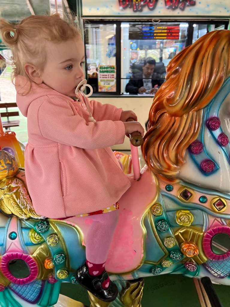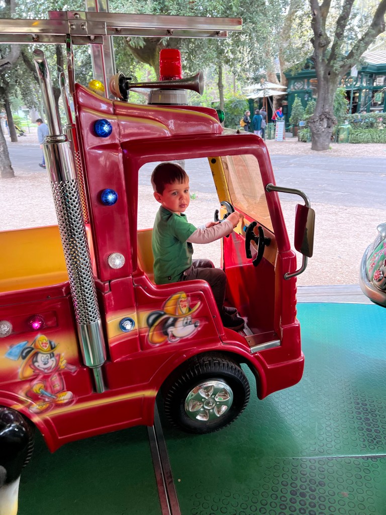 We drove up upon a fanciful merry-go-round. Instead of the traditional horse merry-go-round, It was like someone knew our kids and designed the exact things our kids would want to ride… Lightening McQueen, rainbow unicorn, fire truck, princess pony… it was a little spooky to be honest.